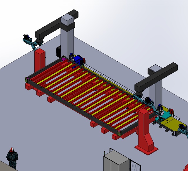 Роботизированная ячейка, основанная на один или двух роботах, на одной линейной направляющей, роботы устанавливаются на консольную портальную конструкцию. Деталь может быть установлена на опоре или на поворотном Позиционере, Система управления процессом сварки может быть как программируемой системой, так и без системы программирования.